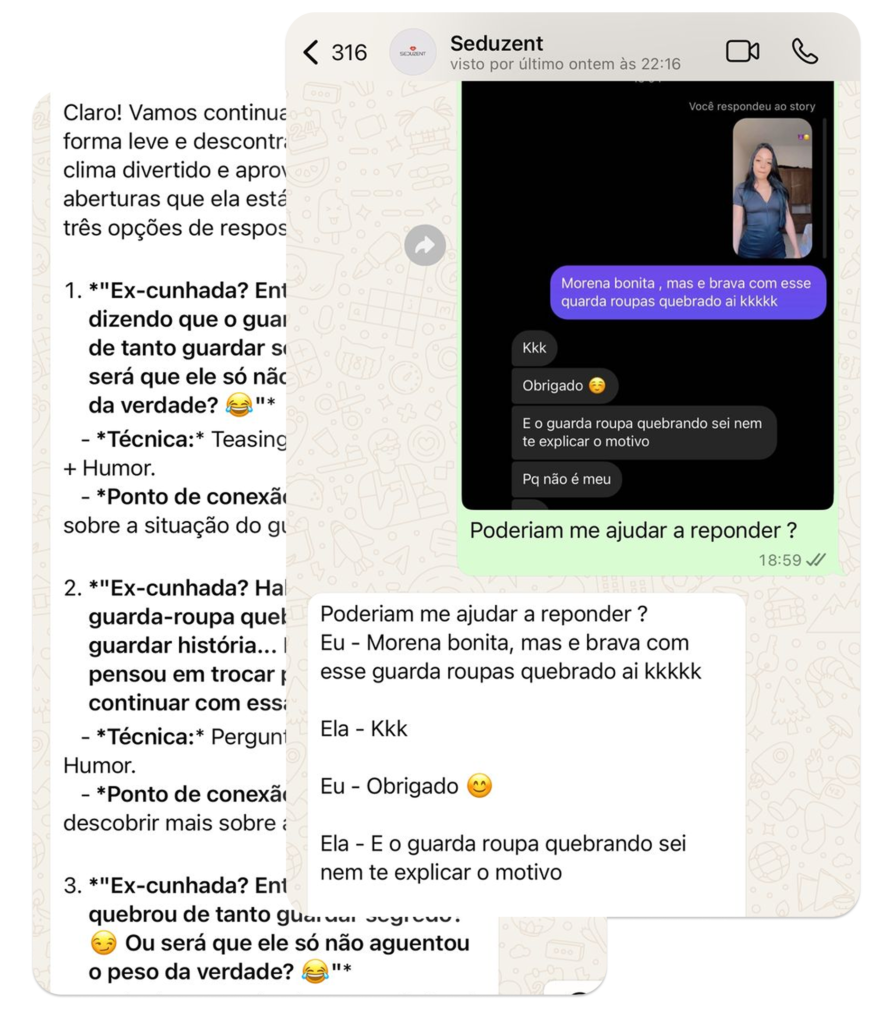 - Não sabe o que mandar? A IA te mostra como pensar como um sedutor, ensinando o raciocínio por trás de cada mensagem.